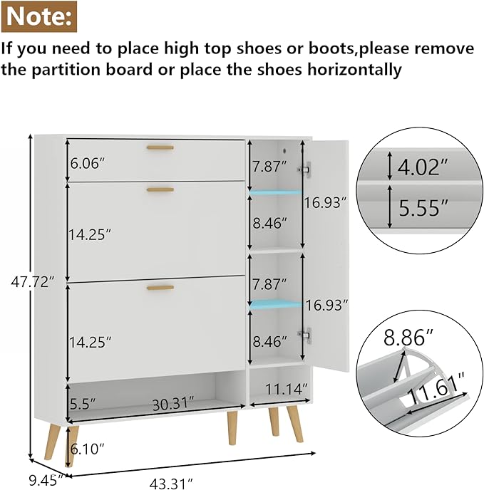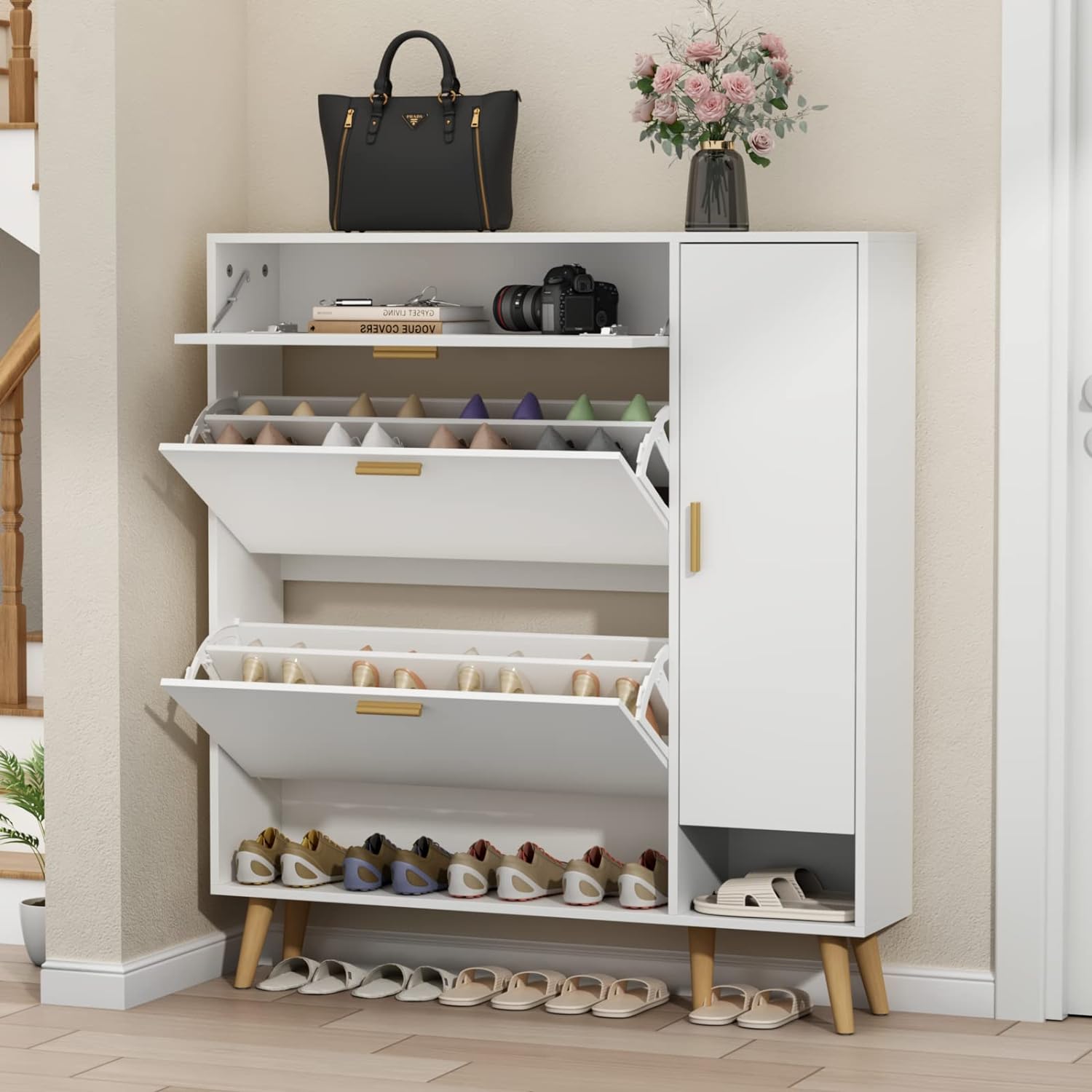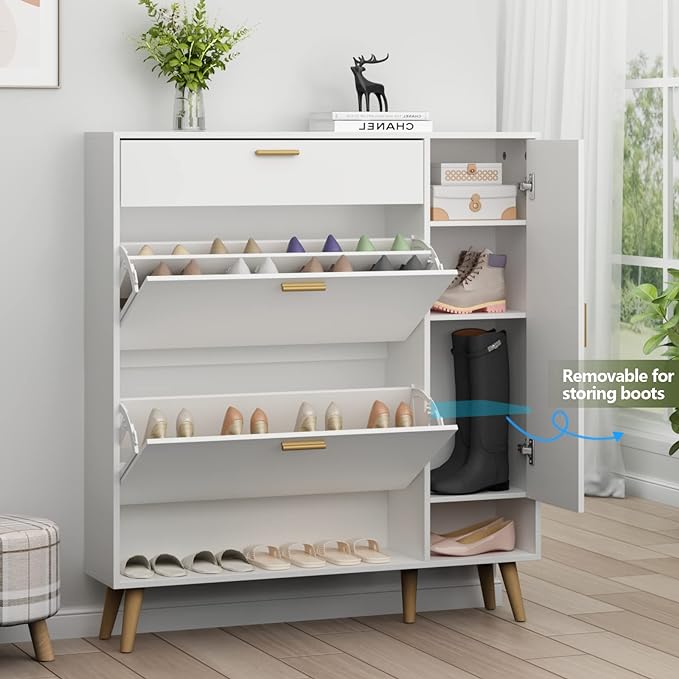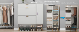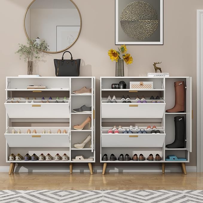 ¡Optimiza tu espacio de almacenamiento con nuestro gabinete de zapatos! Con dos puertas abatibles grandes y compartimentos ajustables, podrás organizar tus zapatos de manera eficiente. Además, el gabinete lateral adicional ofrece espacio extra, perfecto para botas o zapatos altos. Su diseño delgado se adapta a cualquier entrada, manteniendo todo ordenado y libre de polvo. ¡Y no te preocupes por el tamaño de tus zapatos! Nuestro armario flexible se ajusta a tus necesidades. ¡Haz de tu entrada un lugar acogedor y organizado con nuestro práctico armario de zapatos!