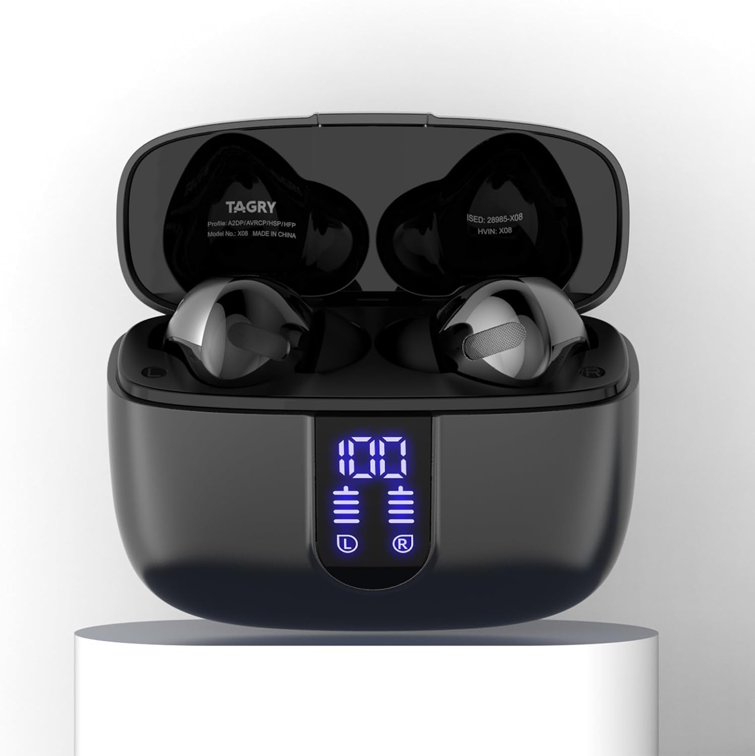 ¡Te presentamos los audífonos inalámbricos TAGRY X08! Con pantalla LED para ver la carga, 60 horas de música y carga inalámbrica. Además, son resistentes al agua IPX5, ideales para cualquier actividad!