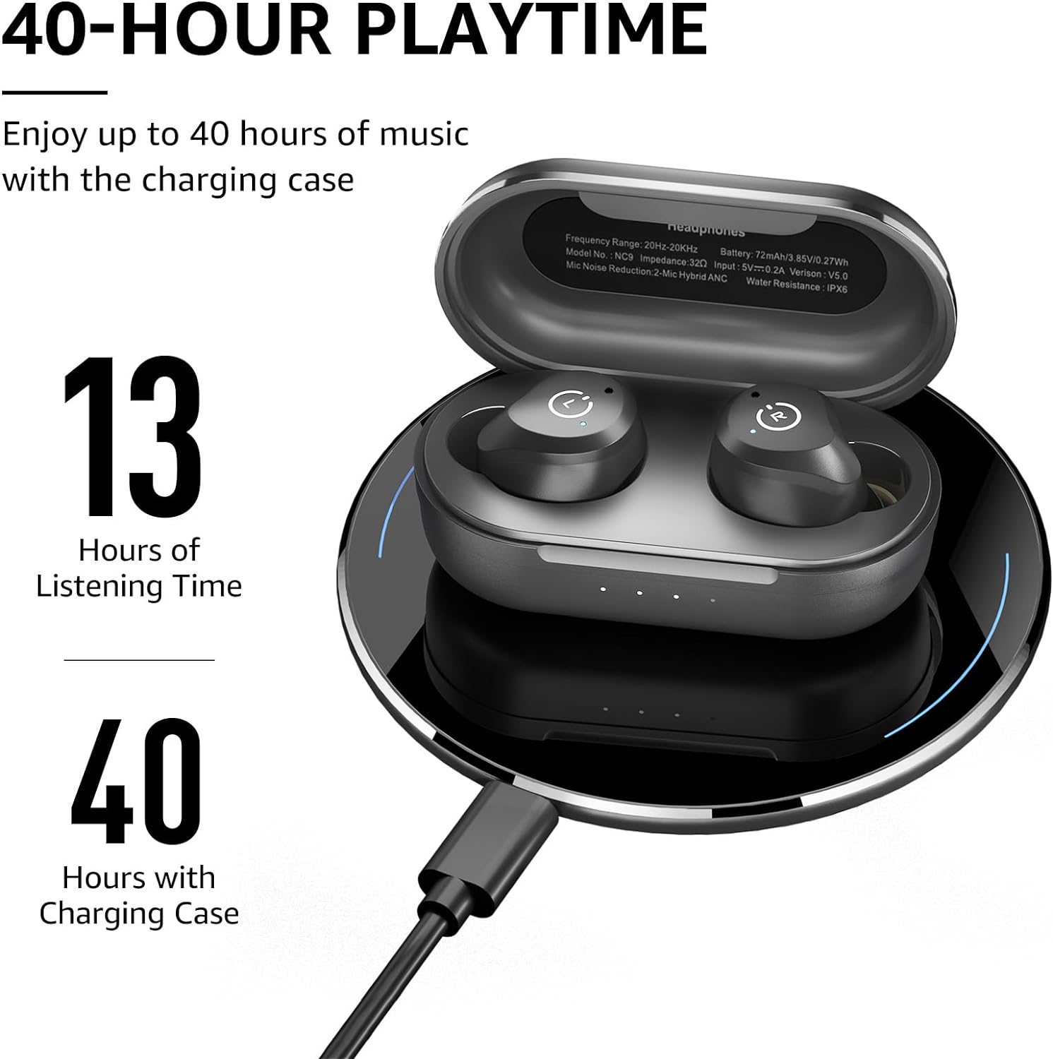 ¿Cuánto tiempo dura la batería de los TOZO NC9? Con una sola carga, los TOZO NC9 pueden durar más de 13 horas de reproducción. El estuche de carga proporciona 27 horas adicionales, y en modo ANC, la duración es de más de 7 horas.