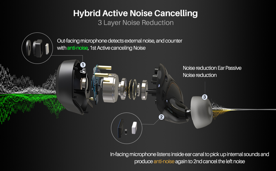 Una de las principales características de los TOZO NC9 es su cancelación activa de ruido de tres capas. Este sistema híbrido utiliza tres estrategias distintas para minimizar el ruido ambiental: